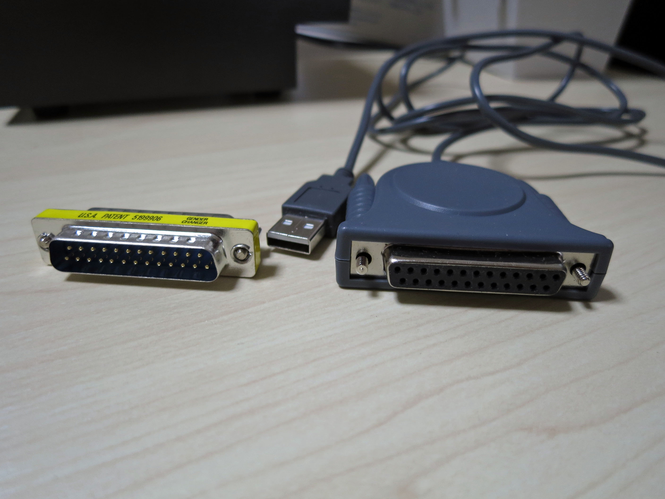 ケーブルを探すのに苦労しました。 最終的にこのケーブルで印刷ができました。 エアリア AREA AR-U1PR2でPC側はUSB、プリンター側はD-Sub25ピンのメスです。 そのため別途サンワサプライ AD25S-MM(ジェンダーチェンジャー(D-sub25pinオスオス))D-subの変換コネクターです。 これで接続できます。 |