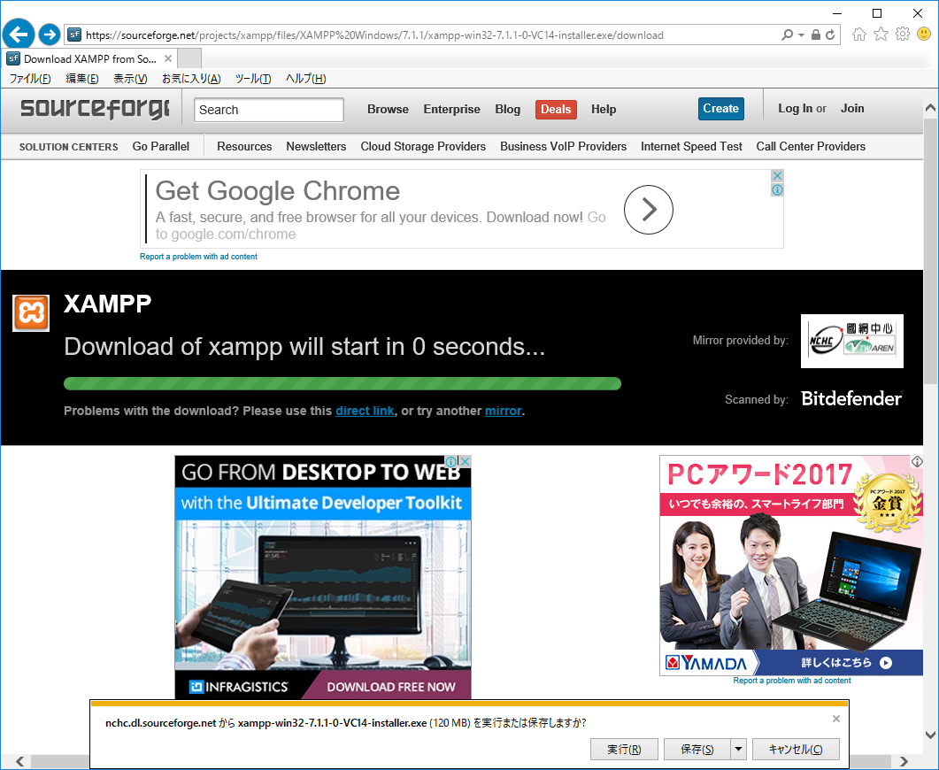 実行または保存をクリックします。 保存を選択した場合、保存先のxampp-win32-7.1.1-0-VC14-installer.exeを実行します。 |