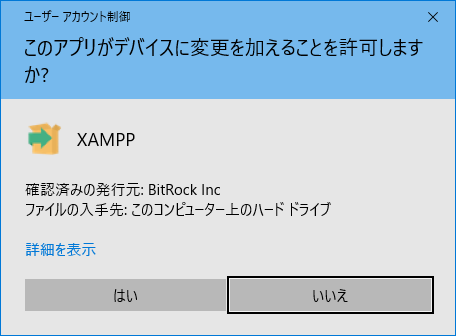 実行するとユーザーアカウント制御のダイアログ確認画面が表示されます。 続ける場合、「はい」をクリックします。 |