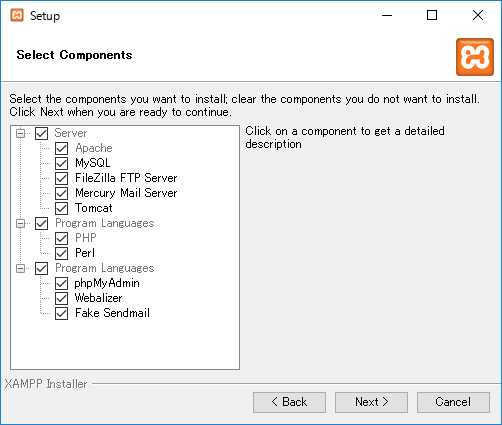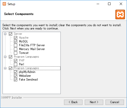 インストールする機能を選択する画面が表示されます。 必要な機能を選択し「Next」をクリックします。 |