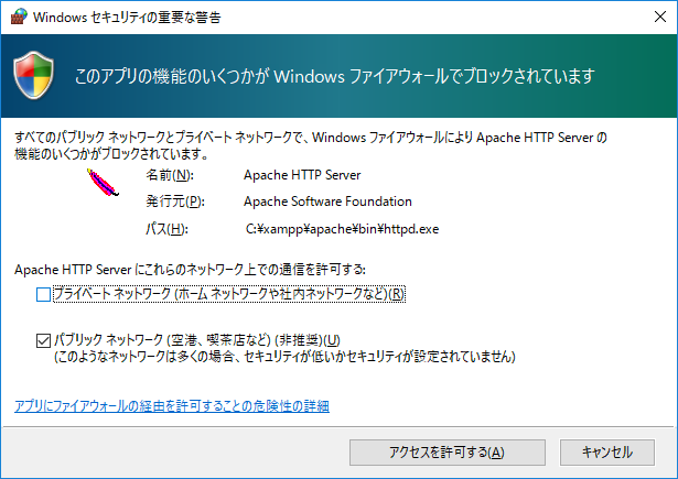 パブリックネットワークのチェックを外しプライベートネットワークをチェックします。 「アクセスを許可する」をクリックします。 |