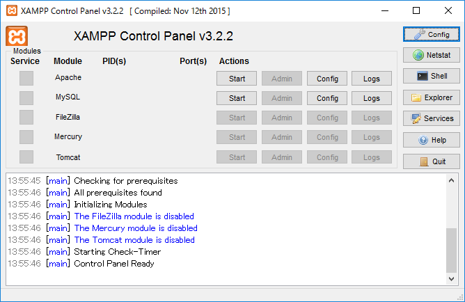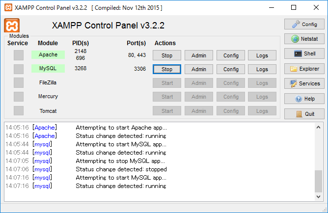 コトロールパネルが表示されました。 FileZila、Mercury、Tomcatはインストールしていないのでボタンがdisableになっています。 ApacheとMySQLのスタートボタンをクリックします。 |
