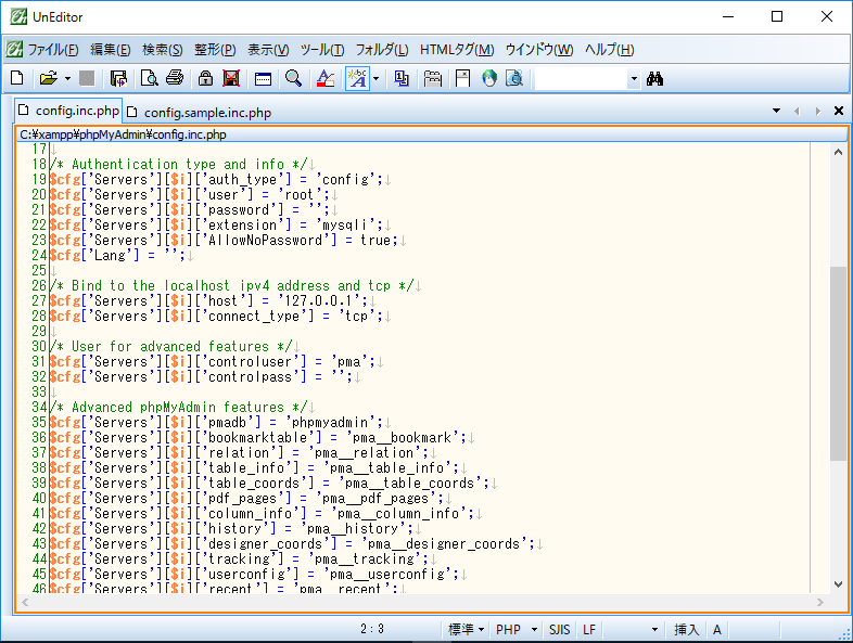左が\xampp\phpMyAdmin\config.inc.phpで右が\xampp\phpMyAdmin\config.sample.inc.phpです。