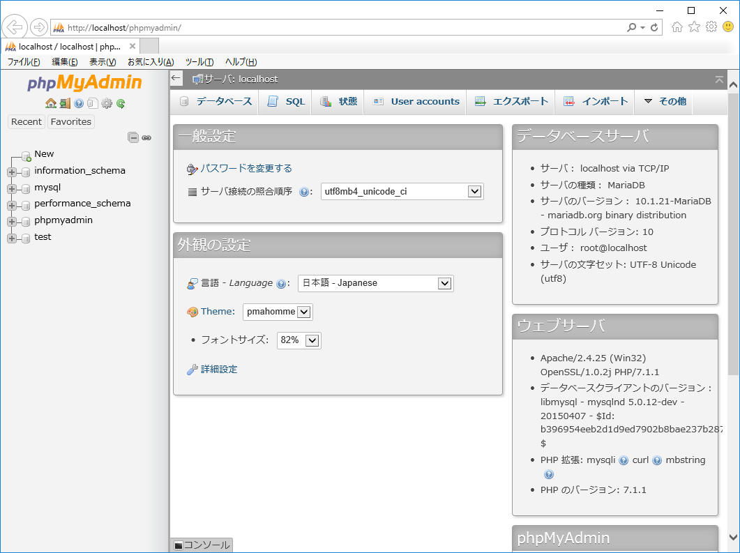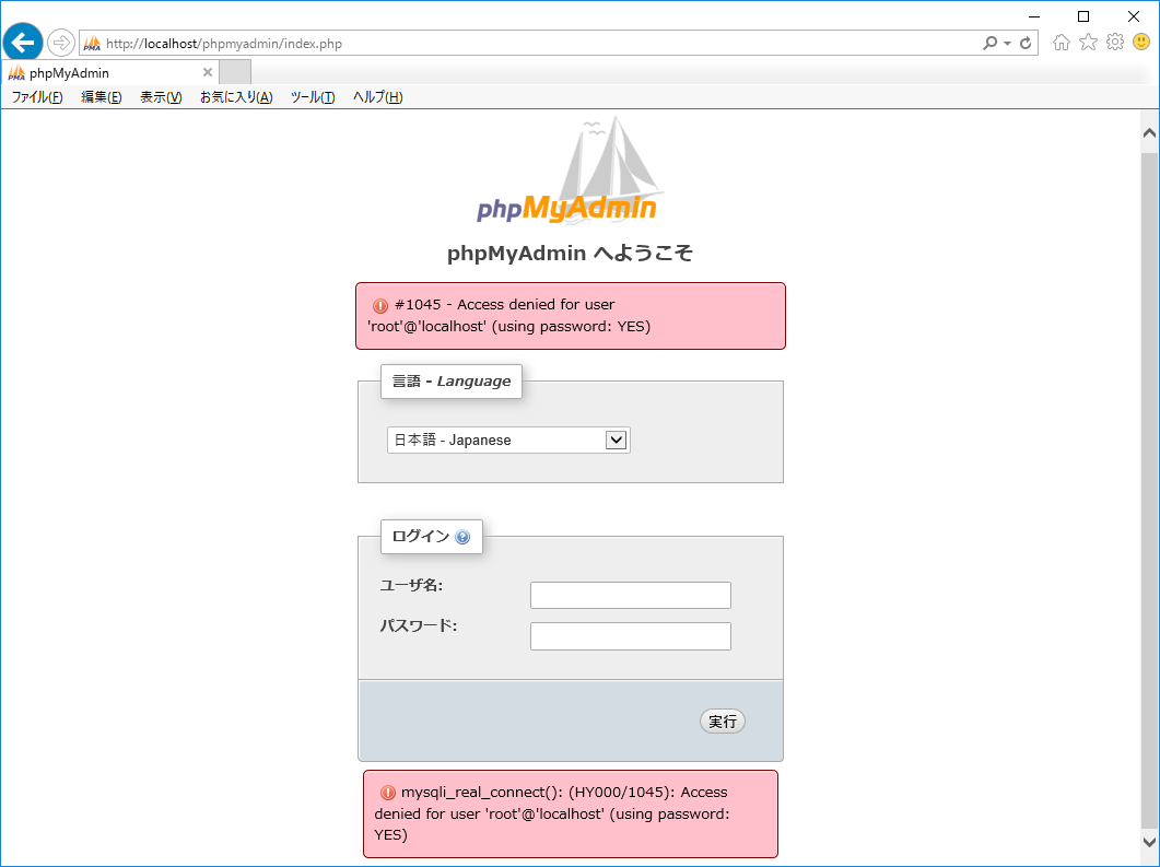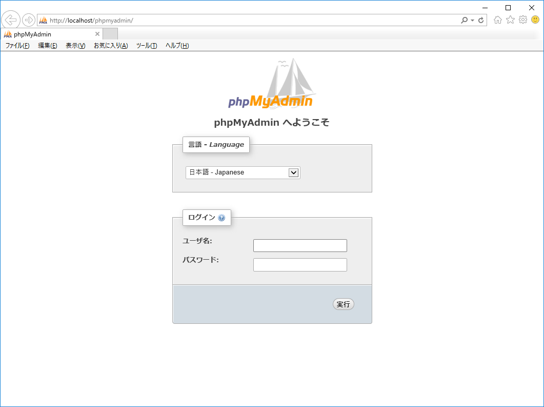 MySQLのadminをクリックするとログイン画面が表示されずphpMyAdminが表示されます。 |