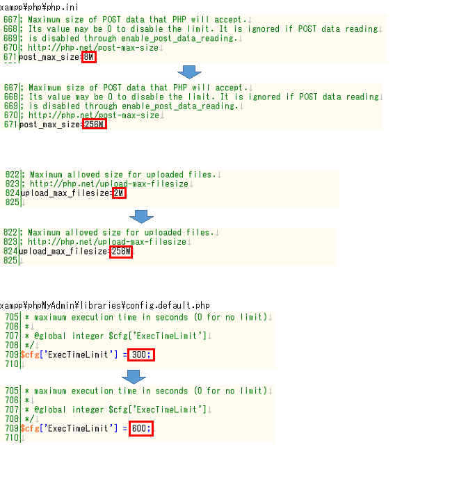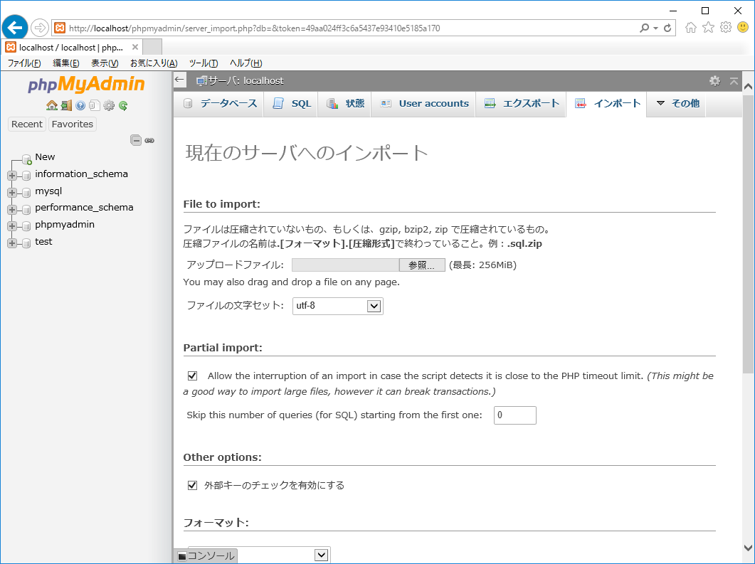 phpMyAdminのインポート画面です。 256MBに増えています。 この状態で180MBのsqlが9分程度でインポートできましたが大きなsqlは面倒ですがmysqlのコマンドで実行したほうが良いです。 |