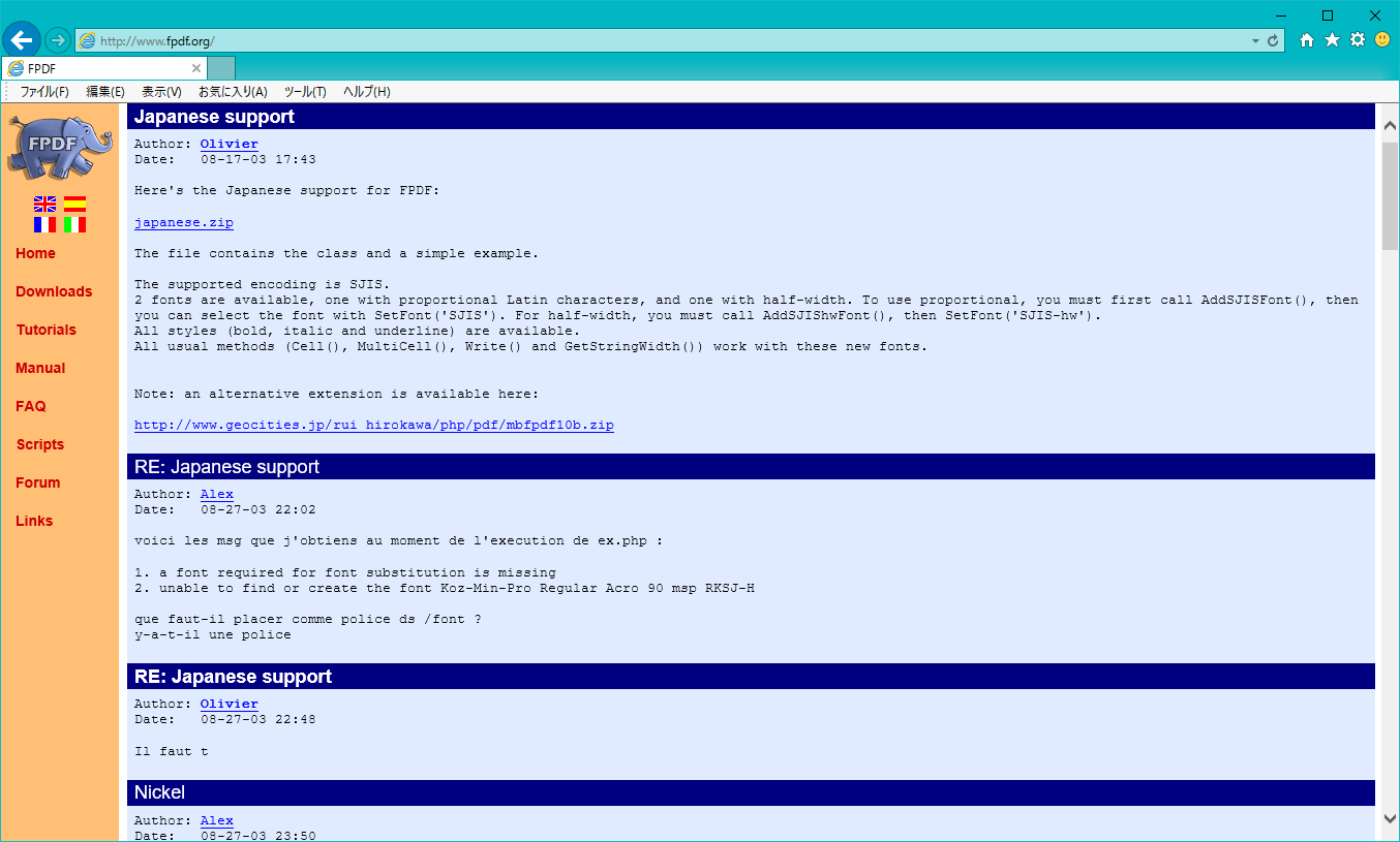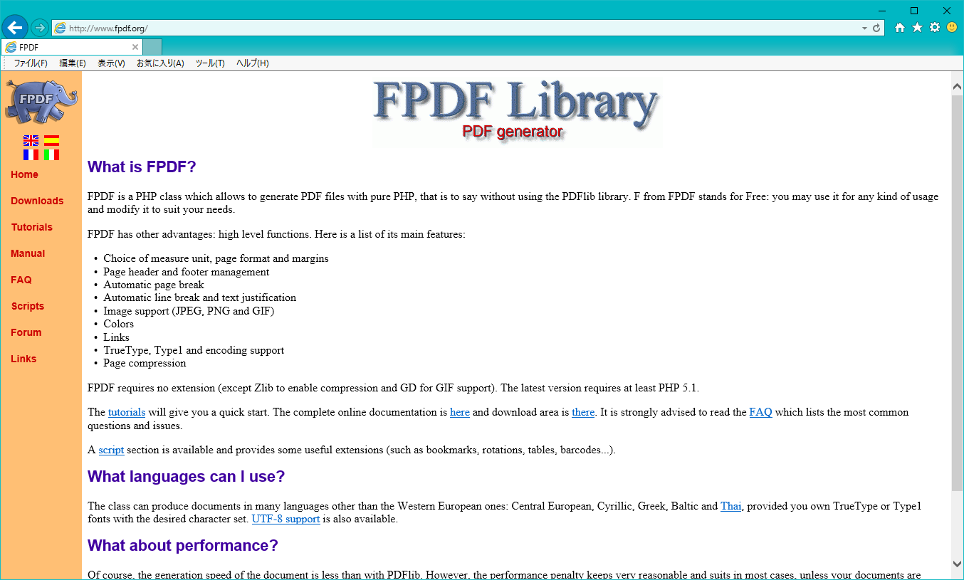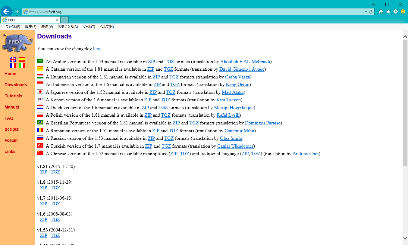 http://www.fpdf.org/ FPDFサイトにアクセスして画面左の「Downloads」をクリックします。 |