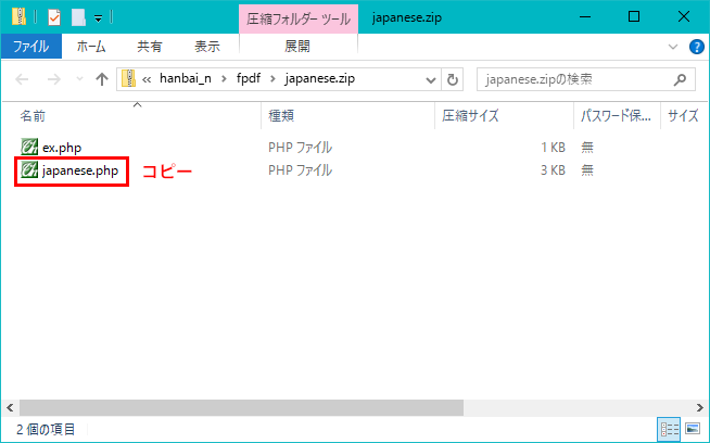 ダウンロードしたzipからjapanese.phpをローカル環境のfpdfフォルダにコピーします。 |