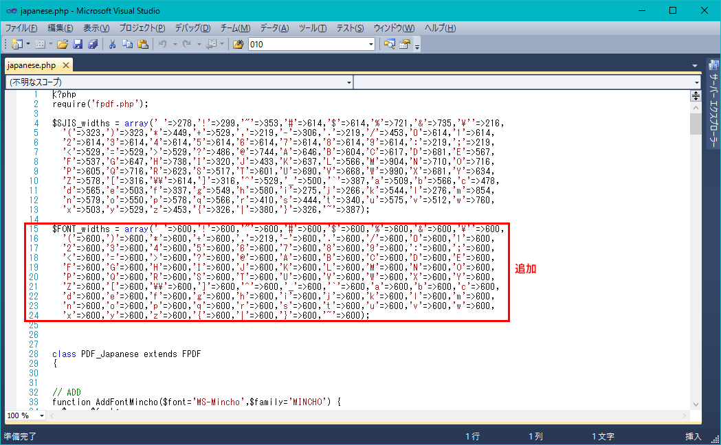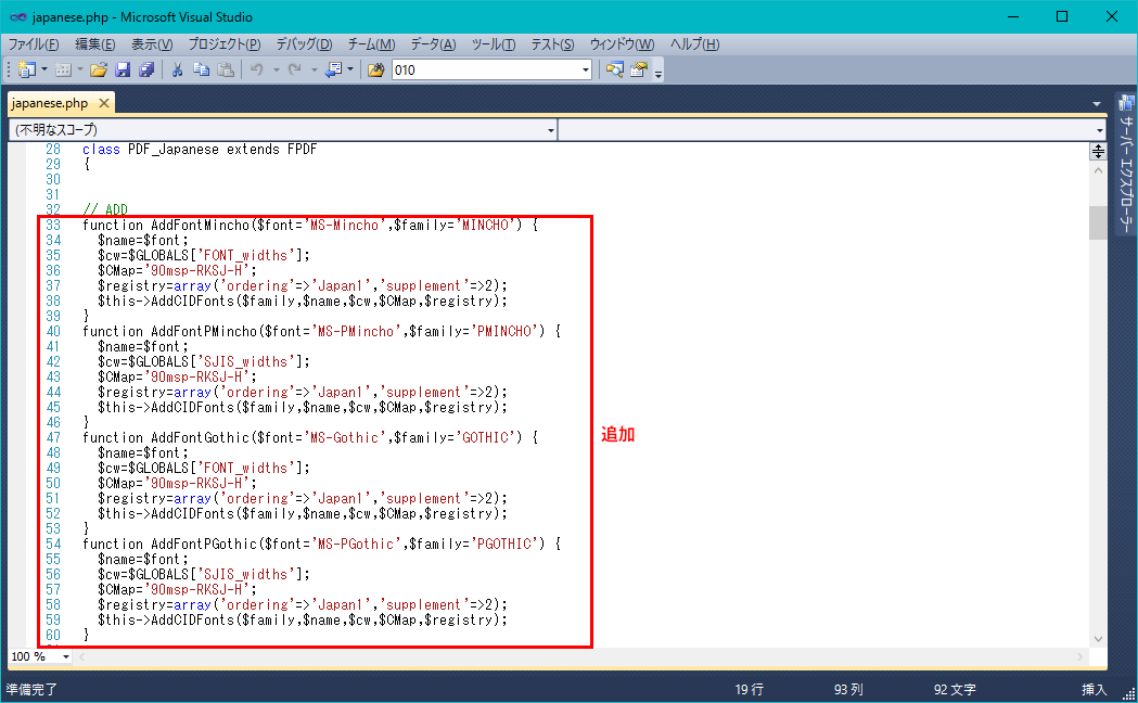 このままでも日本語のPDFが作れますがフォントが微妙なのと今までのphpプログラムでゴシックや明朝を指定していたので修正が大変なことからjapanese.phpに少し手を入れました。